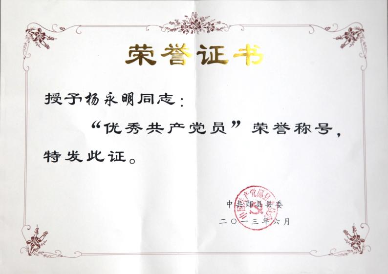 喜訊(xùn):“七一”建黨(dang)前夕,公司(sī)黨支部書(shū)記、總經理(lǐ)楊永明同(tóng)志被中共(gòng)鄖縣縣委(wei)授予“優秀(xiu)共産黨員(yuán)”榮譽🈲稱号(hao)