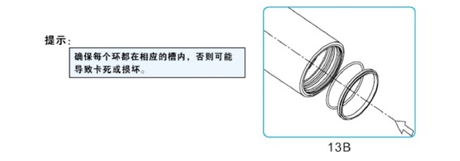 由導向(xiang)帶開始(shǐ),然後是(shi)油封和(he) O 型圈(quan)、防塵圈(quān),切勿把(ba)油封裝(zhuang)反有油(you)封溝槽(cao)的一面(mian)朝缸筒(tong)裡側裝(zhuang)完油封(fēng)和 O 型(xing)圈、防塵(chen)圈。